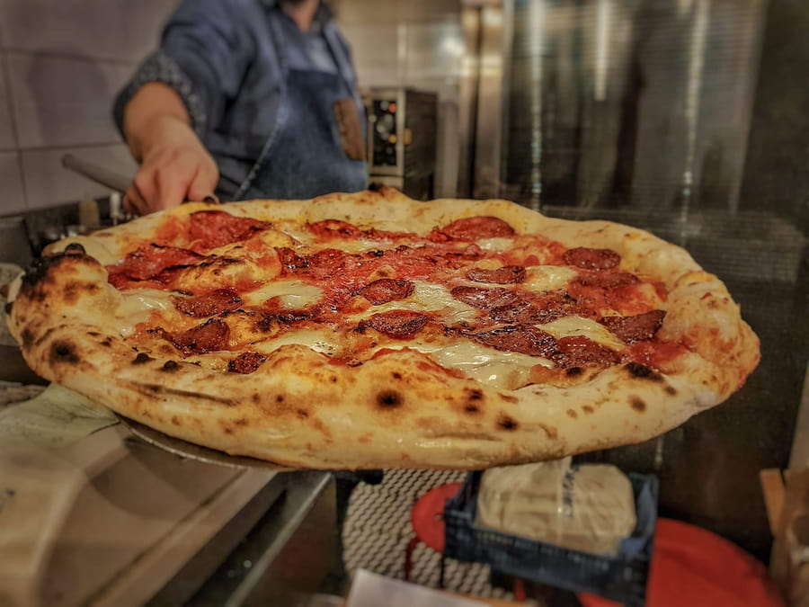 Όταν τελικά παίρνεις το καυτό κουτί στα χέρια σου και ανοίγεις το καπάκι, αντικρίζεις την ουσία της ναπολιτάνικης φιλοσοφίας. Ξέχνα τις «φορτωμένες» πίτσες με τα βουνά από αλλαντικά που καλύπτουν κάθε γεύση. Εδώ η πίτσα υμνεί την απλότητα: μια εξαιρετική, λεπτή ζύμη με εκείνο το χαρακτηριστικό φουσκωμένο και τραγανό στεφάνι (cornicione), ποιοτική σάλτσα ντομάτας και φρέσκια μοτσαρέλα. Με την πρώτη δαγκωνιά, γεύεσαι τα υλικά να αναπνέουν και απολαμβάνεις ένα ζυμάρι αέρινο και εύπεπτο, με μια ελαφριά καπνιστή επίγευση που σπάνια συναντάς πια στη Θεσσαλονίκη.
