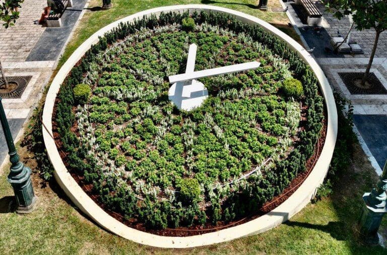 Το «Ρολόι Ανθοκομίας» στολίζουν 400 φυτά του είδους λαντάνα, δηλαδή για φυτά που έχουν ανθοφορία όλο το καλοκαίρι και το φθινόπωρο. Σε χρώμα φουξ με κόκκινο, παράλληλα έχουν χαμηλή απαίτηση σε πότισμα. Τις φυτεύσεις συμπληρώνουν 500 λευκά αγγελόνια, που αγκαλιάζουν την περίμετρο του ρολογιού και τους δείκτες. Τα φυτά στο «Ρολόι Ανθοκομίας» θα αλλάζουν ανά έξι μήνες, ώστε να έχουν χρώμα και ζωντάνια όλες τις εποχές του χρόνου.